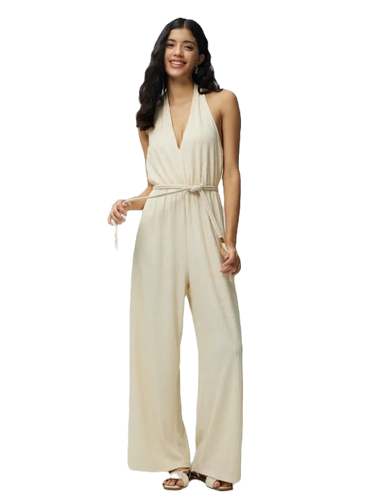 Featuring a Off White deep halter v neck and pleated detail. Made of synthetic fiber, it has a flared hem for a fashionable look.